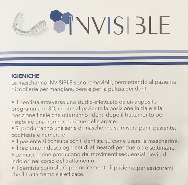Le mascherine invisibili sono aligner trasparenti e rimovibili che allineano i denti gradualmente. Vengono realizzate su misura per te in base alla tua impronta dentale e sono praticamente invisibili.
